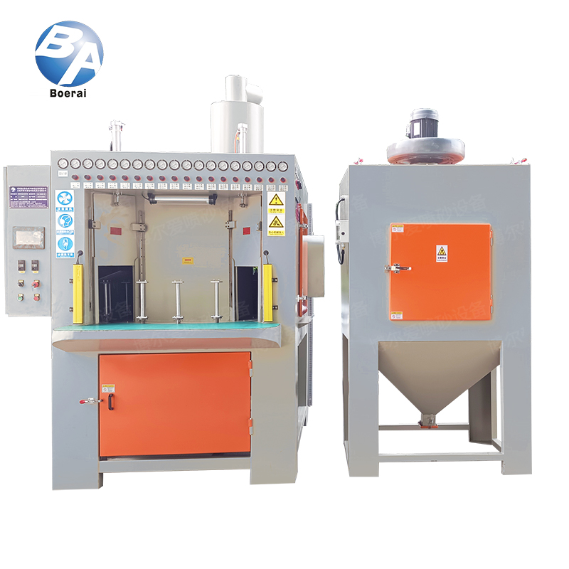 设备特点:1、采用先进PLC控制系统,自动化程度高,稳定性好。2、喷枪组可水平、垂直移动,亦可多角度摆动。3、喷枪可摆动也可定点喷砂,喷枪摆动速度及小转台自转均可变频调节。4、设有9-18把喷枪,喷枪摇摆可变频调速,每支喷枪压力可根据加工要求分别调整。5、设有4个工位,大转盘间歇运作,小转盘自转,喷枪可水平,垂直,自由调节,喷砂时间可根据喷砂效果自行设定。
